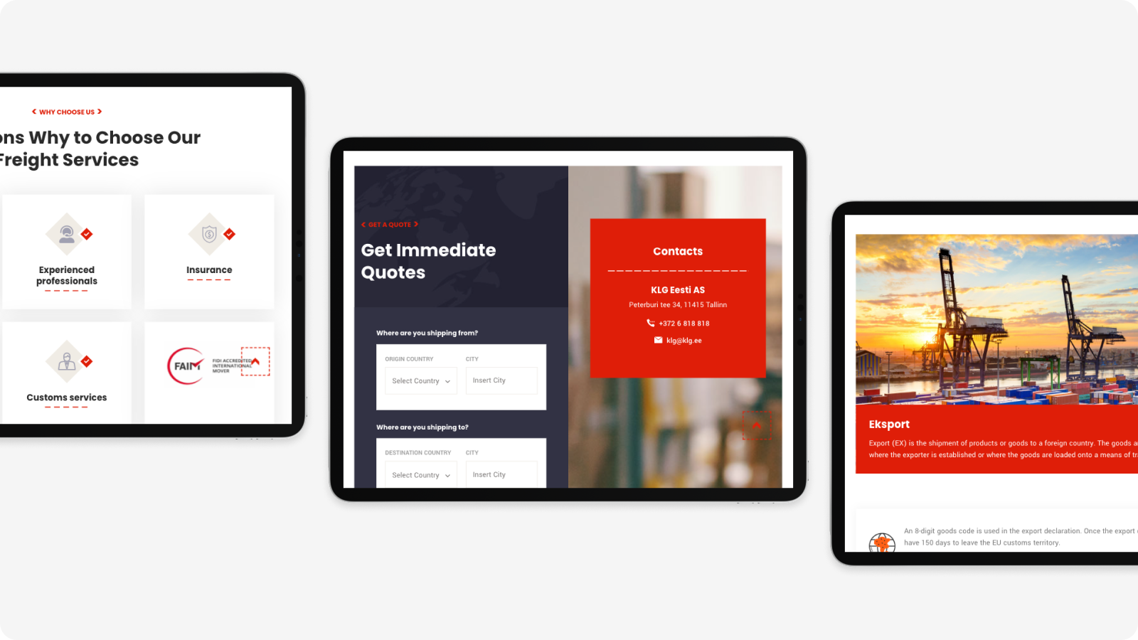 KLG serves both private and corporate clients across air, sea, and rail routes, with add-ons from storage to art handling. The goal was to present this breadth clearly, in three languages (ET/EN/RU), while driving quote requests and highlighting certifications and partner networks for social proof.