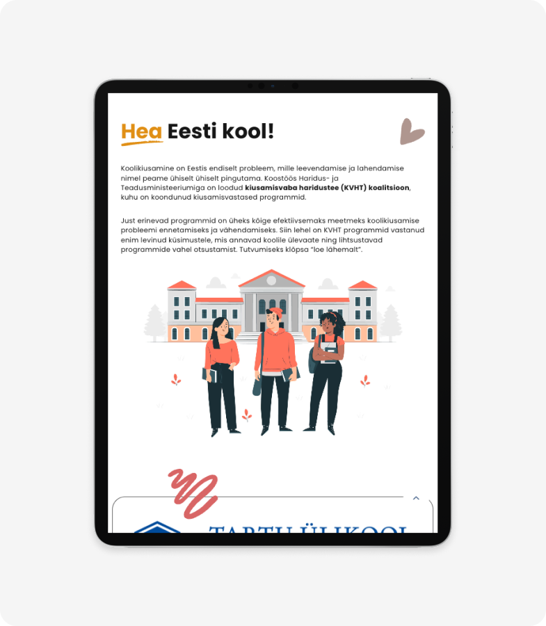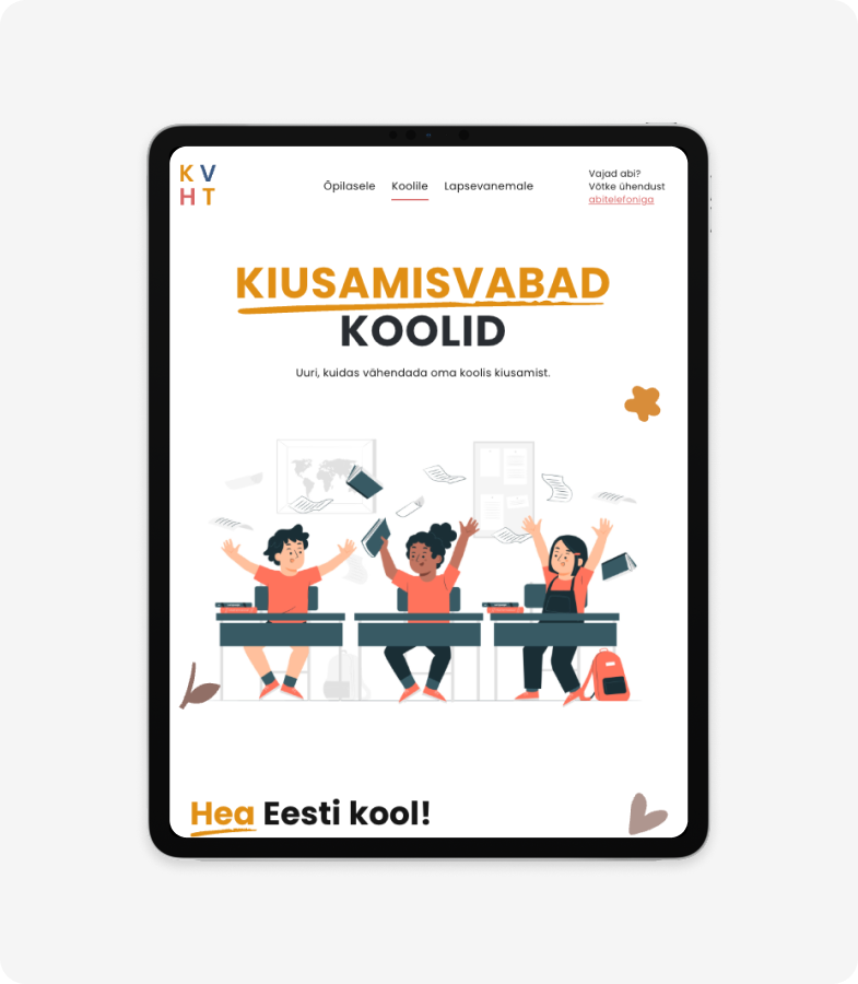 Built a WordPress portal for the KVHT coalition to centralize anti-bullying programs and guidance for students, schools, and parents, in cooperation with the Estonian Ministry of Education. The site provides clear pathways, practical advice, and help contacts in one place.